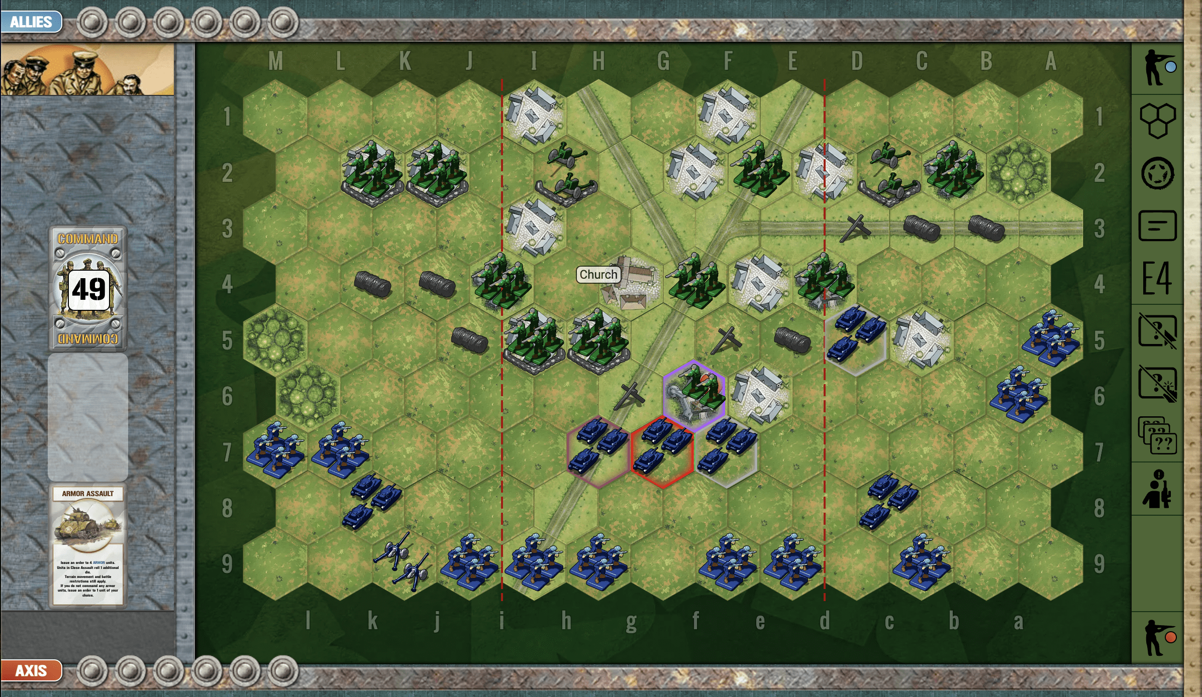 Because there are so many armor units near the city, the enemy is overwhelmed. They will be able to hit one or two figures, but the damage has been done. As the Axis moves their armor away in the next few turns, they will be making way for successful close assaults from their incoming infantry.