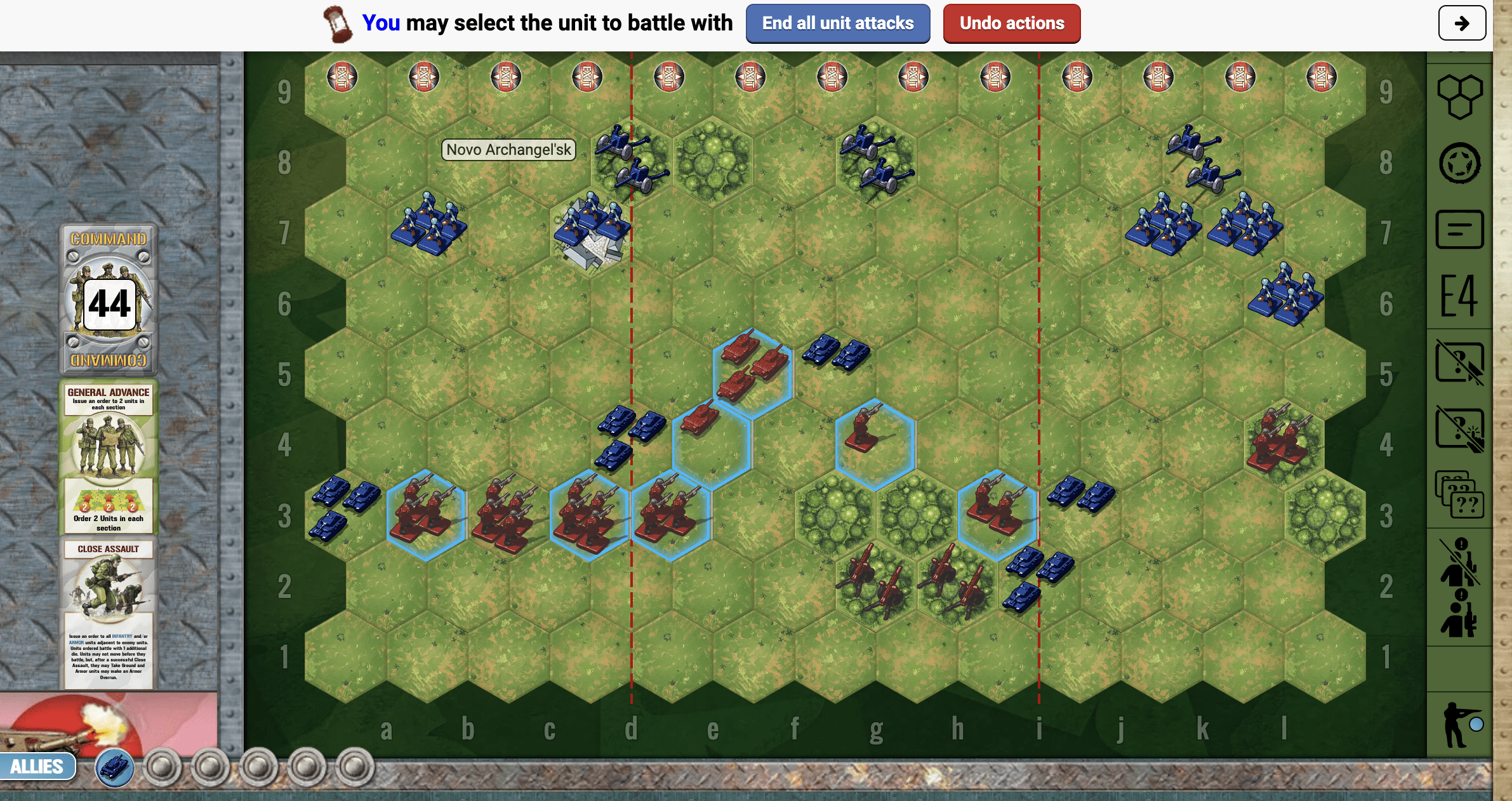 Usually, you should play a Close Assault card as soon as you can. But when the Commissar is controlling your attacks that is hard to do. I gave this card to the Commissar when the Axis had just two units adjacent to mine. But then he played a General Advance just in time. By the time the turn was over, there were 7!! of my units available for my Close Assault card.