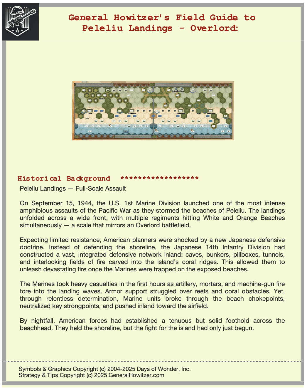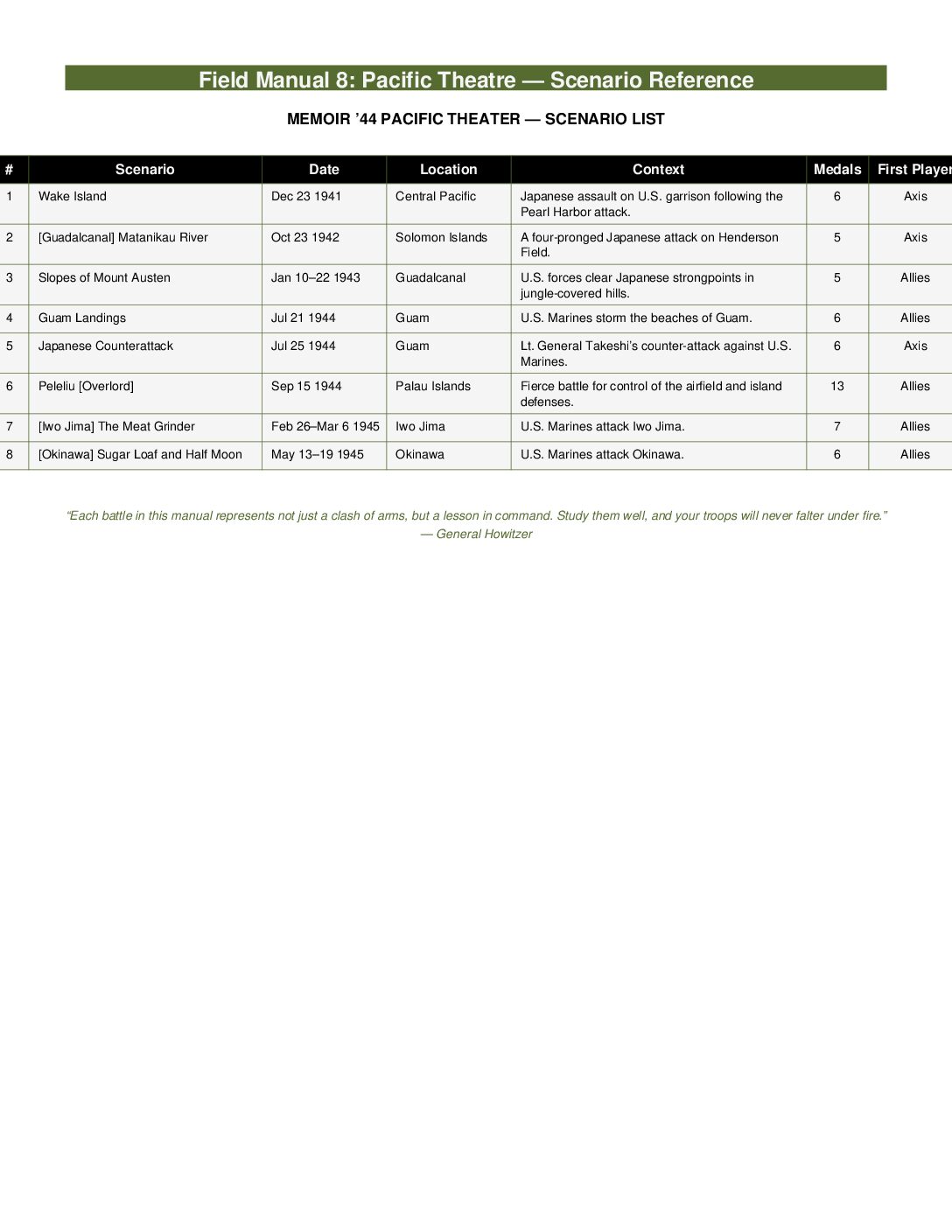 Field Manual 8A: Pacific Theatre is your fast-access battlefield guide to the most intense Memoir ’44 actions of the Pacific War. From the desperate stand at Wake Island to the brutal meat-grinder battles of Iwo Jima and Okinawa, this manual distills each scenario into a clean, ready-to-play snapshot—dates, objectives, terrain, and who strikes first. Included is the incredible overlord scenario of the Peleliu Landings. Whether you’re storming beaches, or holding jungle strongpoints, every mission is laid out for immediate tactical clarity.