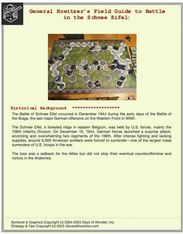 Enhance your Memoir ’44 experience with a scenario guide designed to elevate every battle you play. Each guide delivers a clear historical snapshot, streamlined briefings, detailed battlefield analysis, and step-by-step strategy tips for both sides—giving players a deeper understanding of the scenario’s terrain, objectives, and tactical opportunities.