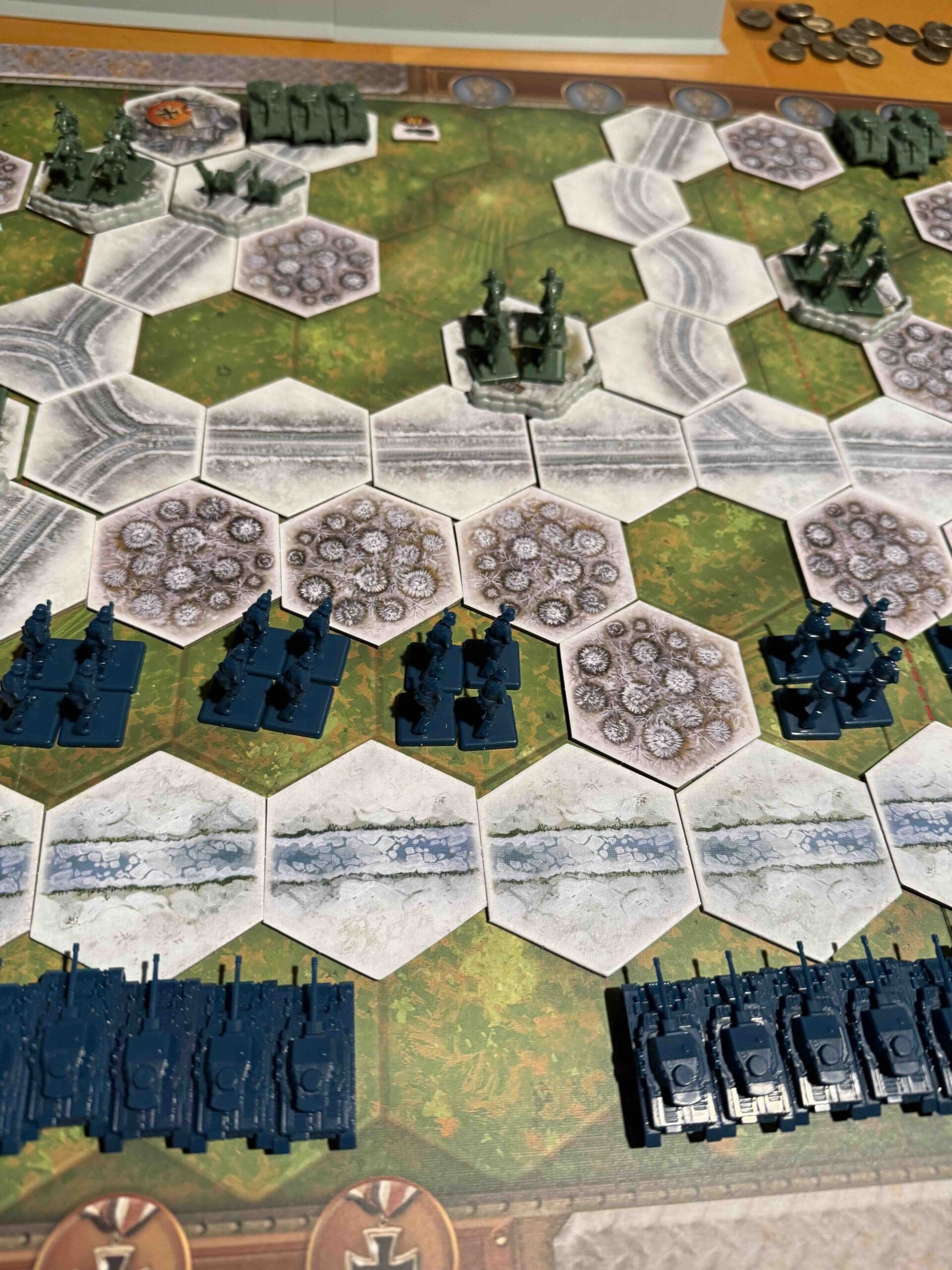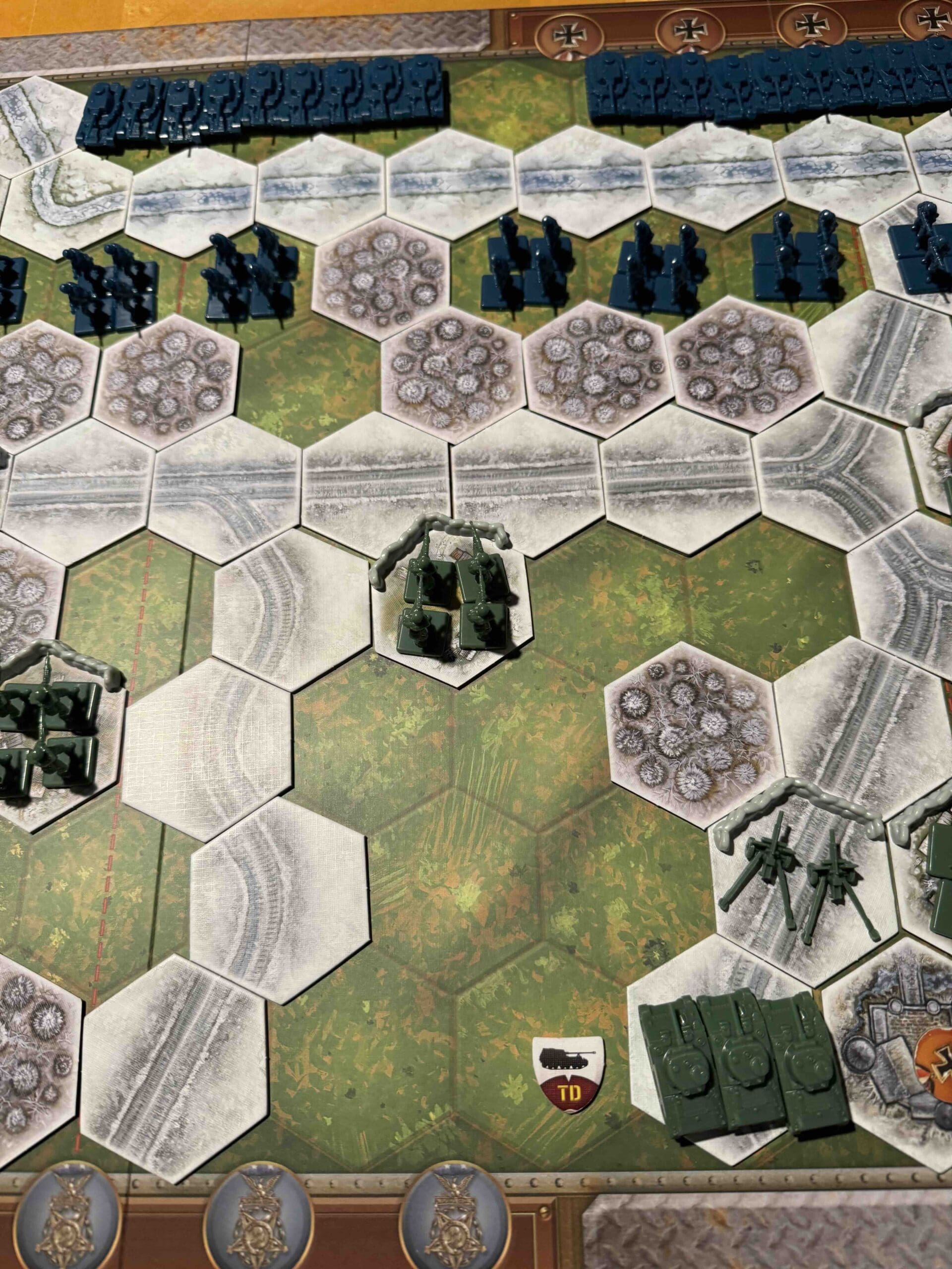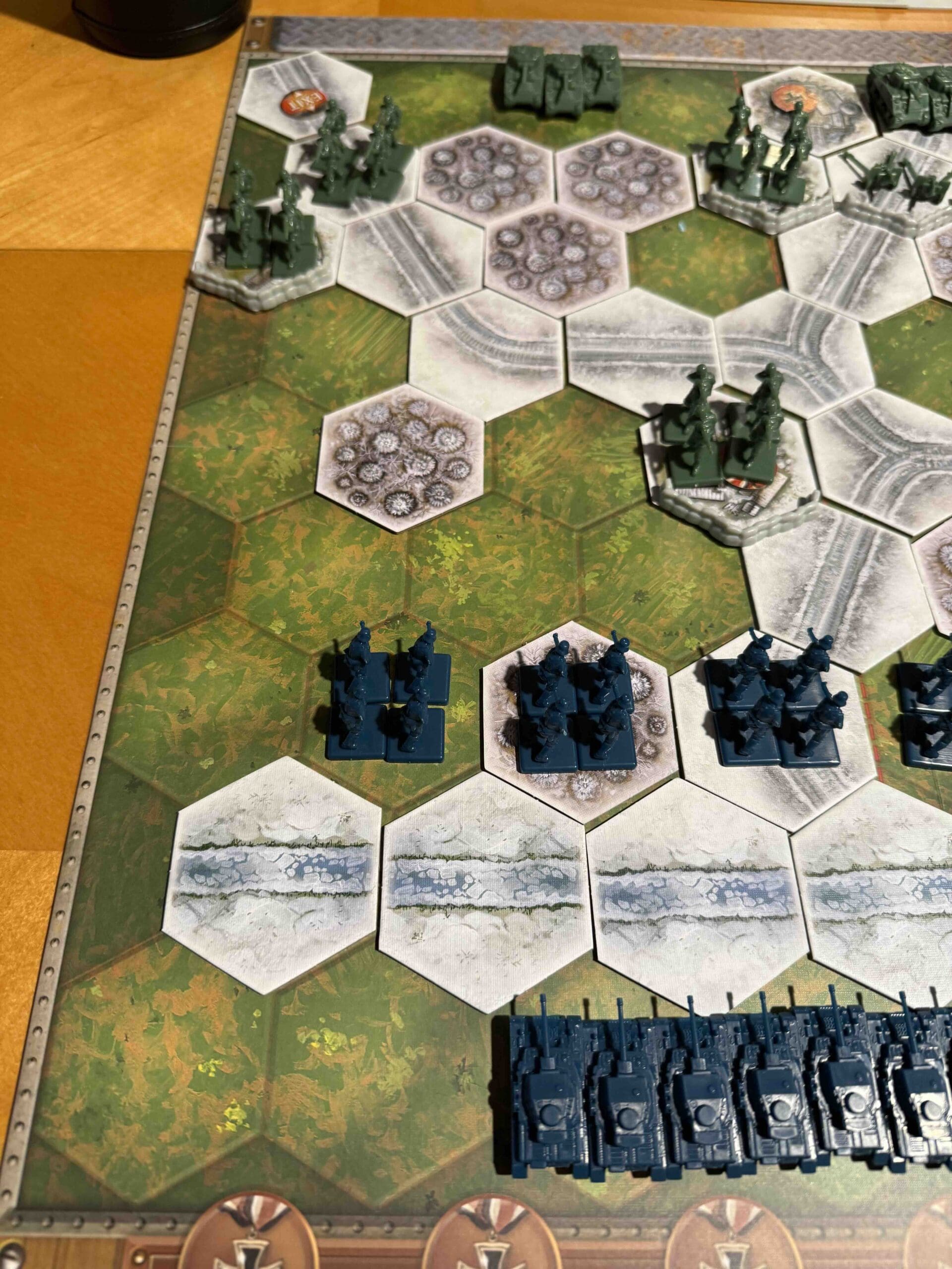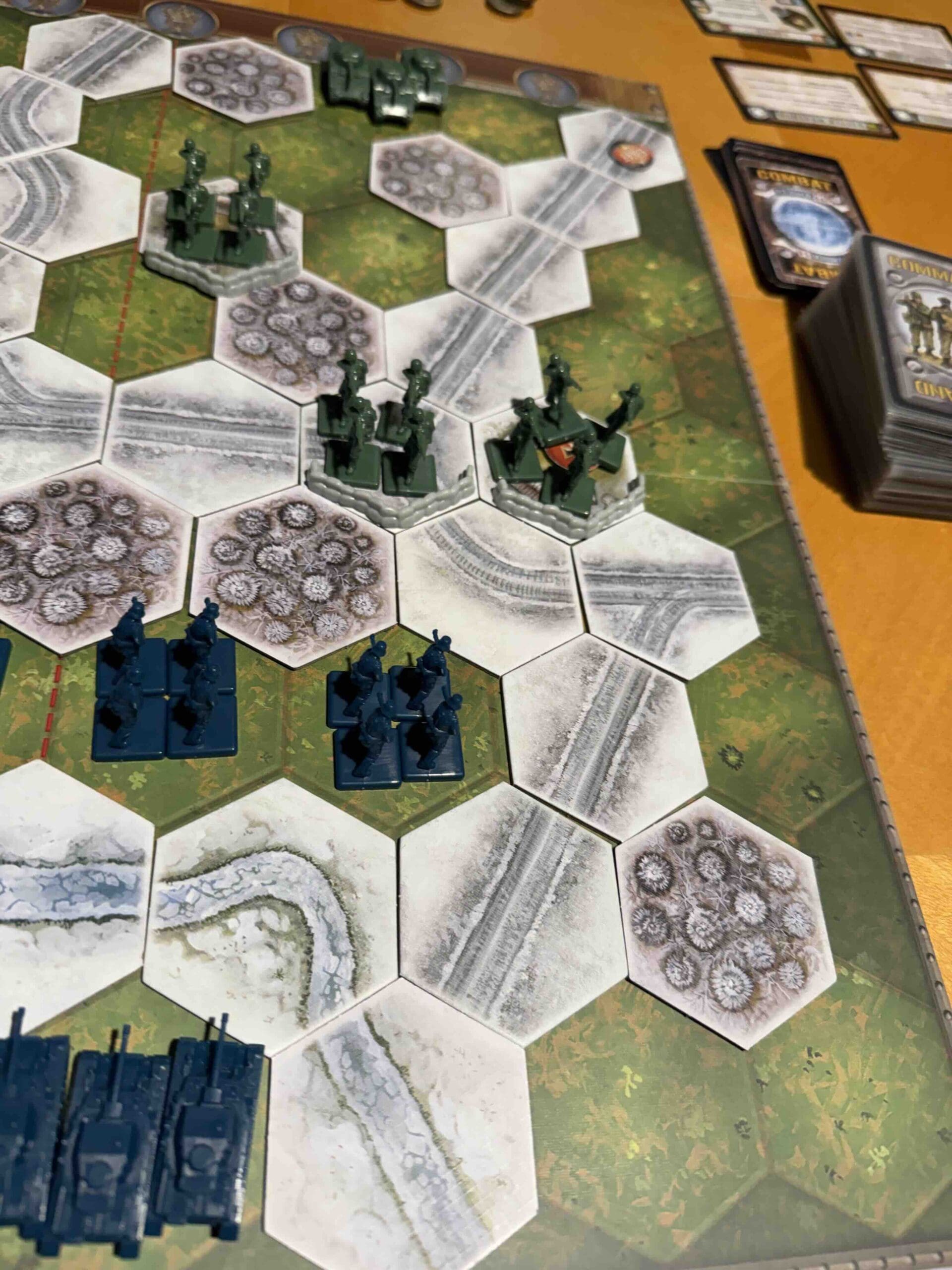 1. First priority is to get some bridges built across the impassable Our River, so that your tremendous tank force can make a difference in this battle. Play an Attack card, and instead of moving three units, build a Bridge in that section.
