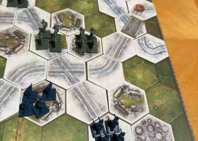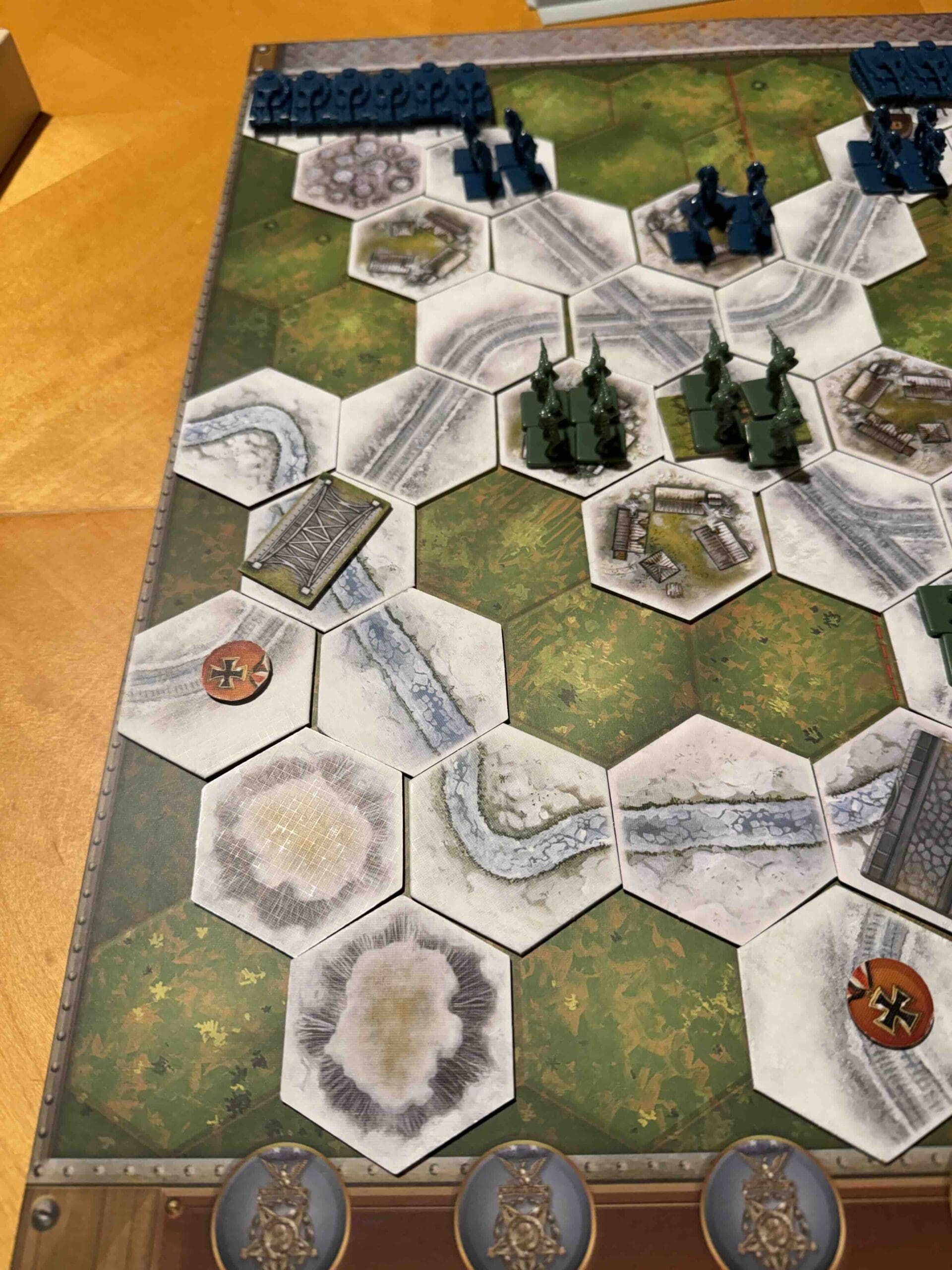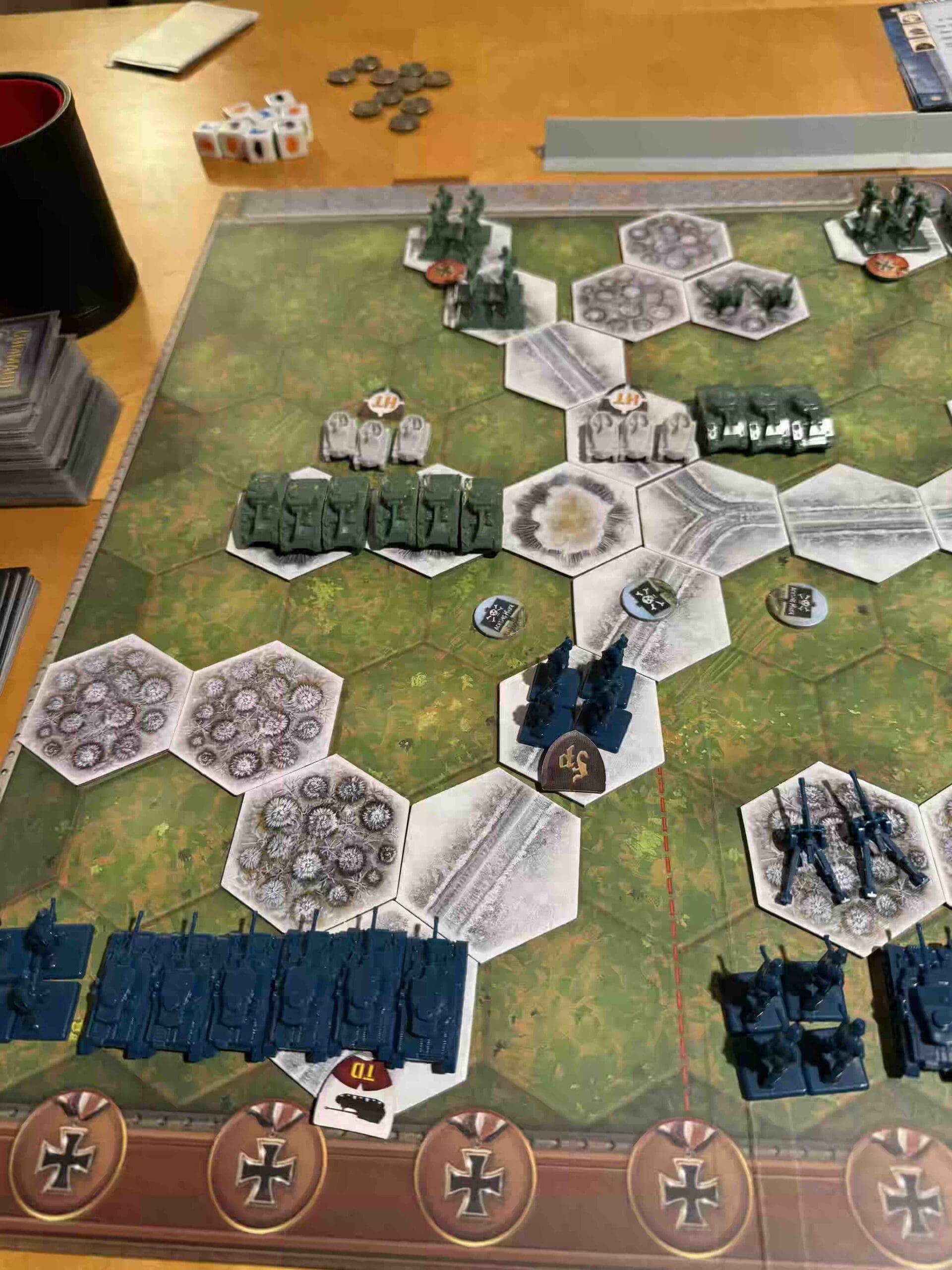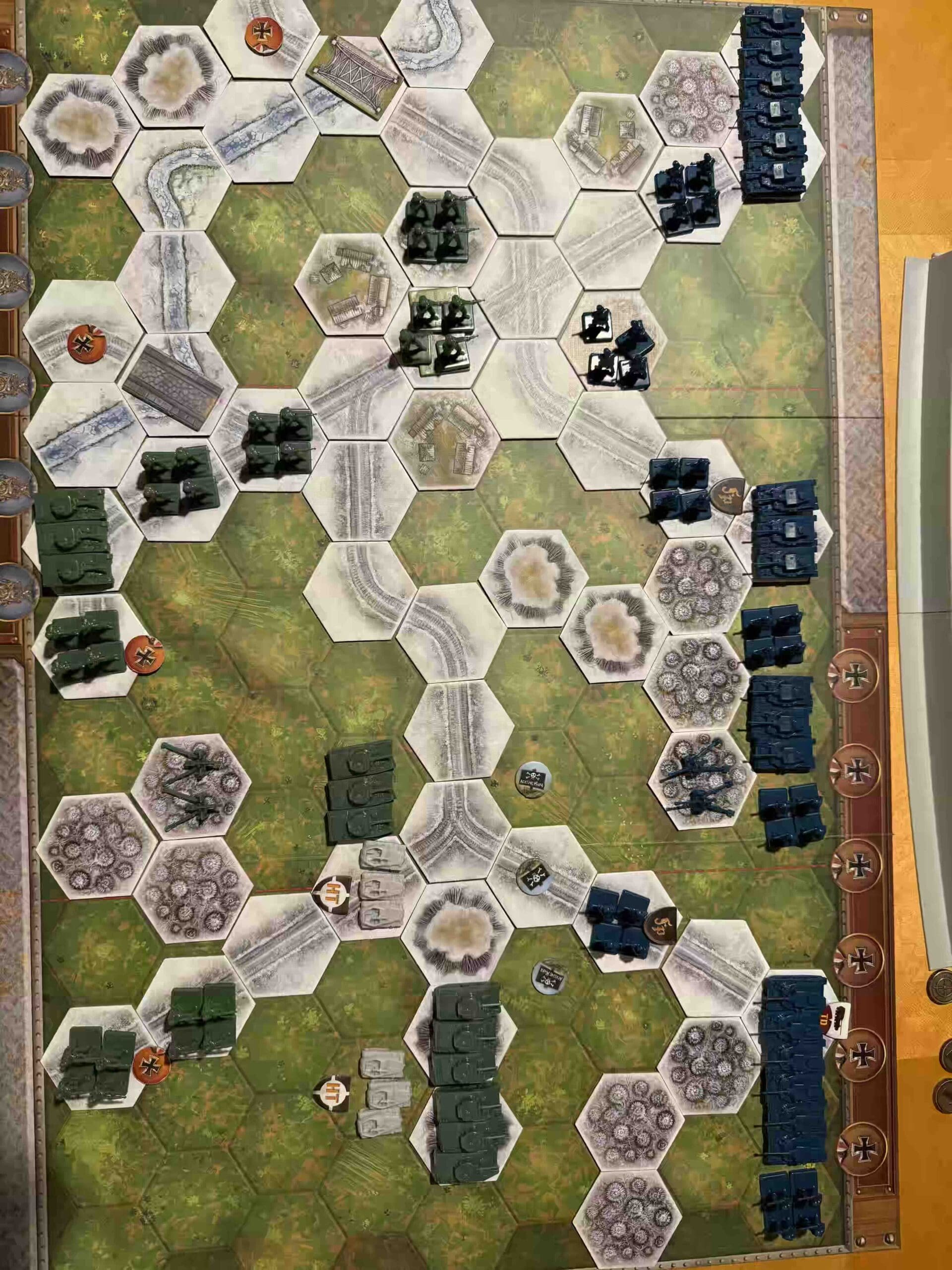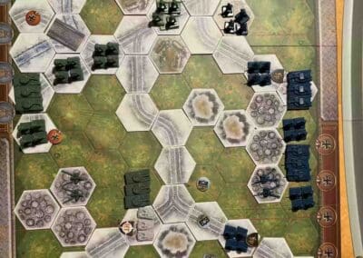 2. Because there are a row of exit hexes which can provide additional medals for you, you should continue a relentless push deep into the enemy territory. If you can bring in your flank forces toward the center, it will make your forces unstoppable.