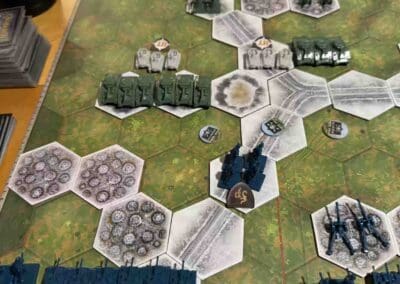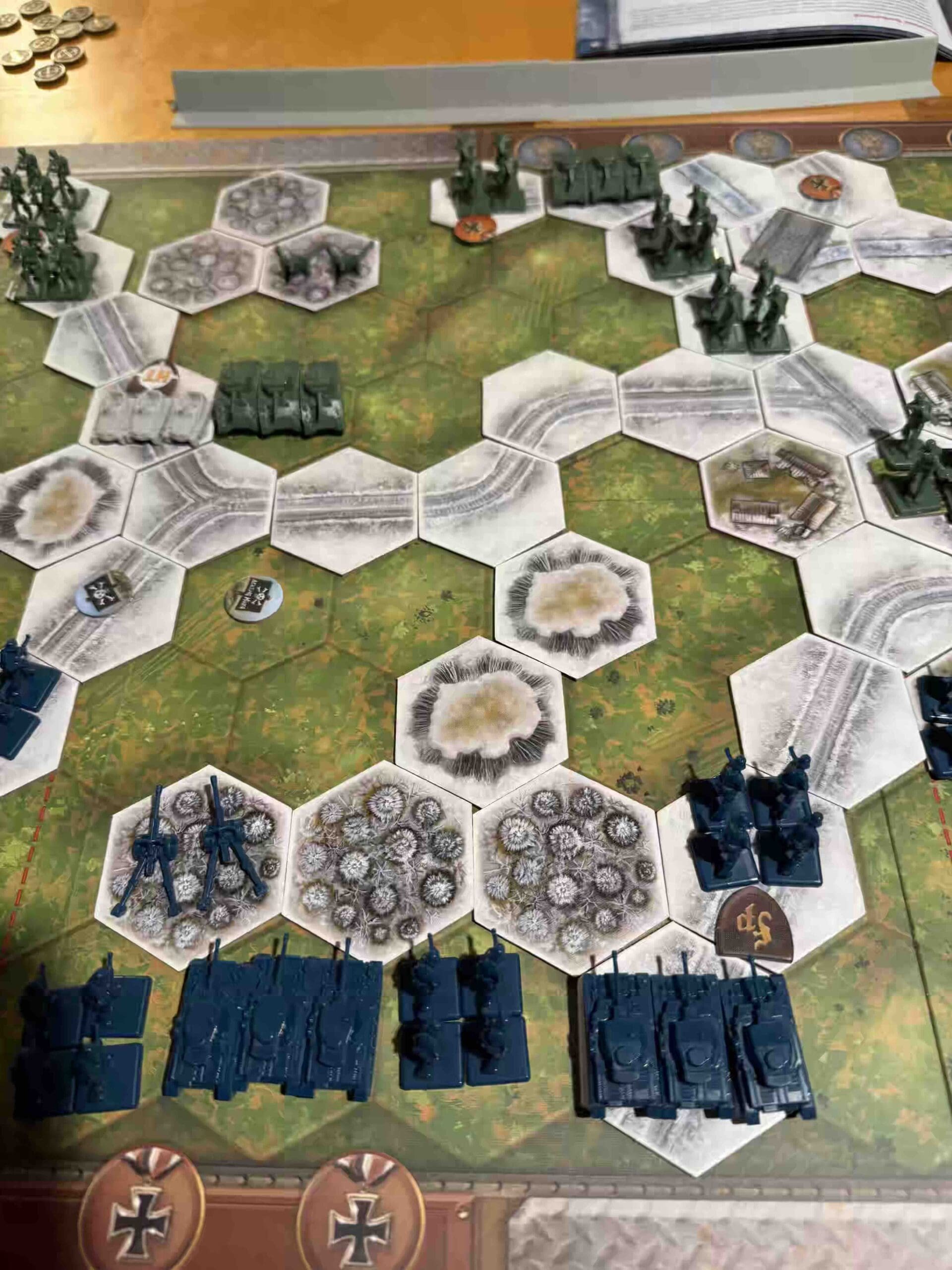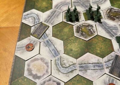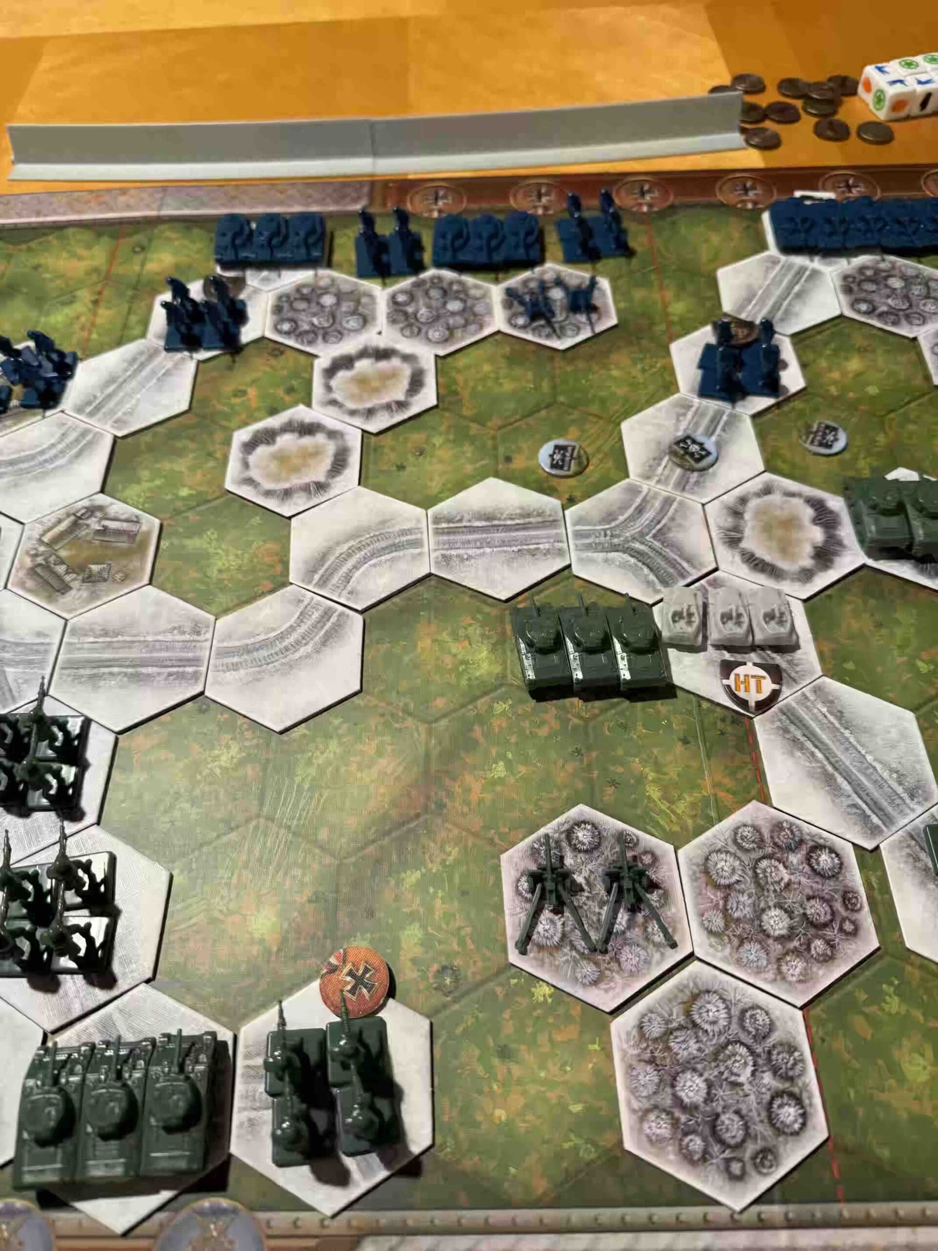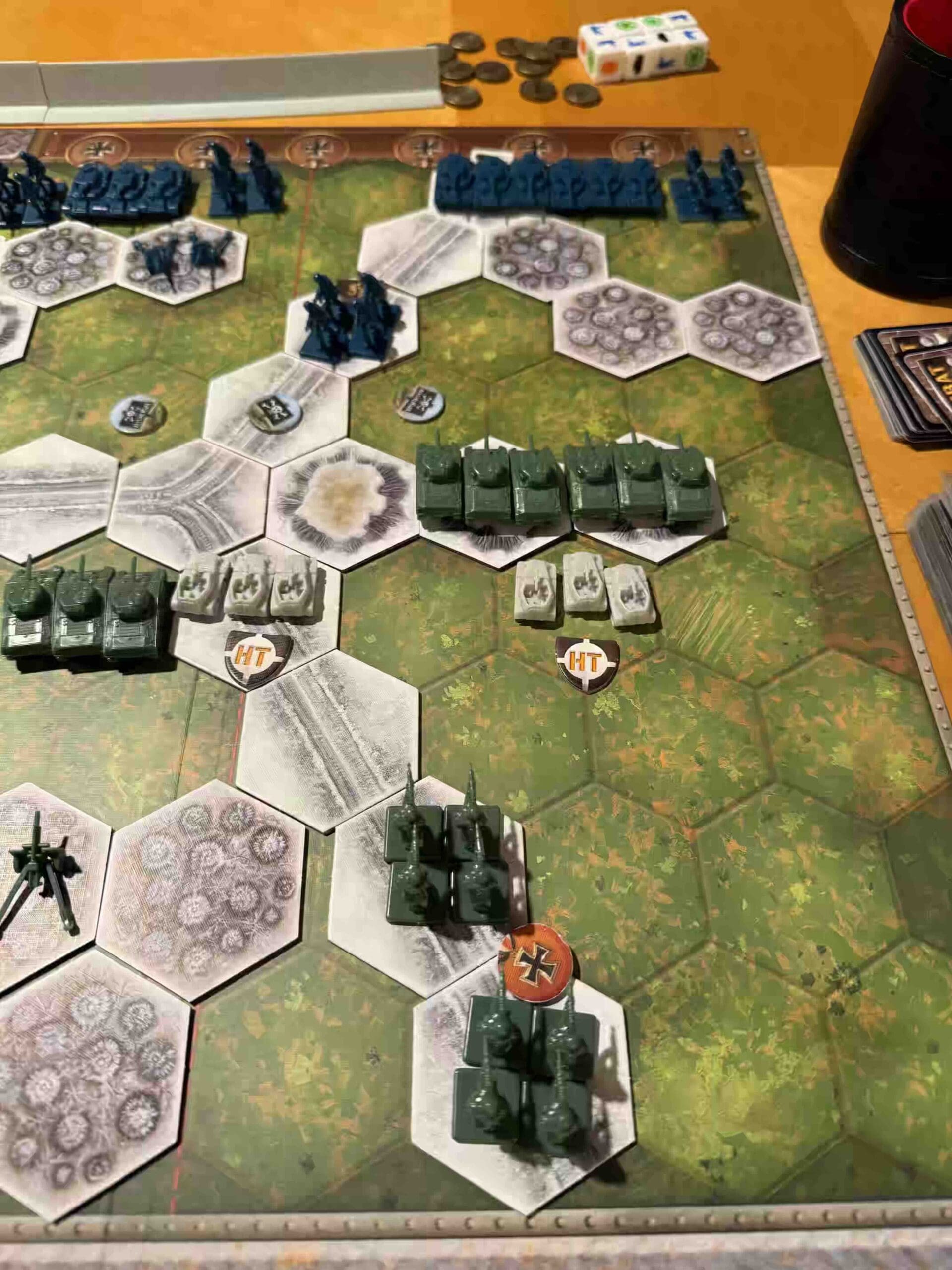 2. Because there are a row of exit hexes which can provide additional medals for you, you should continue a relentless push deep into the enemy territory. If you can bring in your flank forces toward the center, it will make your forces unstoppable.